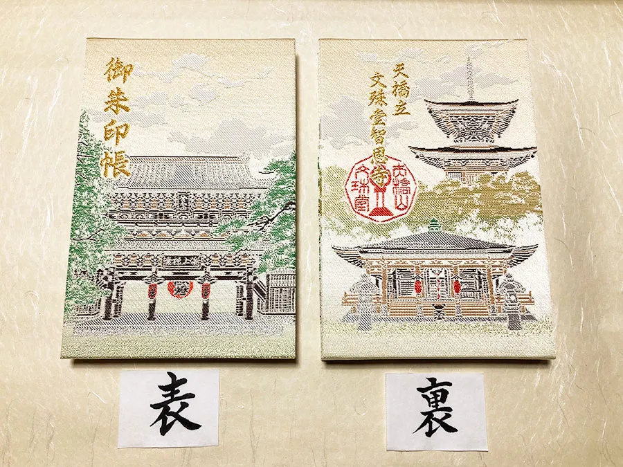 表紙に三門(黄金閣)、裏表紙に文殊堂・多宝塔をあしらった智恩寺オリジナルの御朱印帳です。